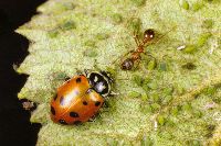 pastores diminutos Os pulgóns son uns insectos de cor verde que viven sobre as plantas e que se aliementan delas. Como son moi pequenos corren o perigo de ser devorados por outros insectos máis grandes, como as xoaniñas. Pero, afortunadamente, os pulgóns teñen quen os defendan: as formigas. As formigas protexen os pulgóns dos seus inimigos coas súas fortes mandíbulas. Ademáis, cámbianos dunhas plantas a outras para que non lles falte alimento. Todo isto fano porque os pulgóns fabrican un líquido doce que lles encanta ás formigas. Para conseguilo, "moxen" os pulgóns coas antenas. |