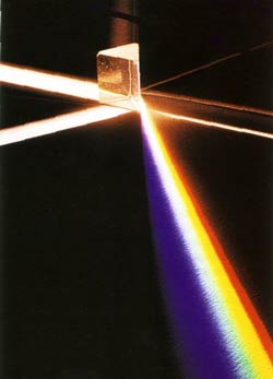 A luz, ao atravesar un prisma transparente descomponse, demostrando que a luz branca está formada pola mestura de luces de todas as cores |