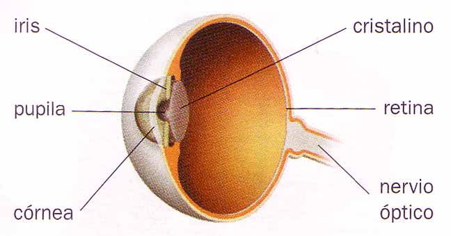 FUNCIONAMENTO A luz atravesa a CÓRNEA e pasa por un burato redondo chamado PUPILA. A pupila está rodeada por un anel de cor chamado IRIS. A pupila faise máis grande ou máis pequena dependendo da luz que entre. Esa luz pasa por unha lente transparente chamada CRISTALINO e a enfoca sobre a RETINA. A retina é a que envía a información ao cerebro polo NERVIO ÓPTICO. No cerebro é onde se interpreta a imaxe que chega polo NERVIO ÓPTICO. |