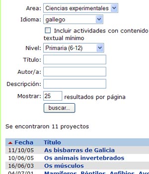 Seleccionamos a área de Ciencias experimentais, idioma Galego,