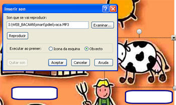 Seleccionamos cada borrón invisible e despregamos o menú contextual SON e buscamos na carpeta de recursos o arquivo de son que lle corresponda ao animal seleccionado. A continuación bloqueamos o borrón no menú contextual (BLOQUEO-BLOQUEAR POSICIÓN). | |