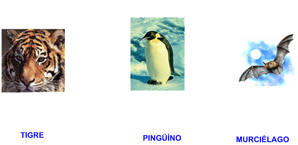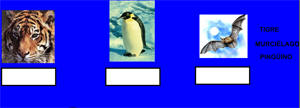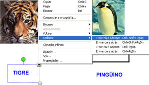 Imos a INSERIR IMAXE e imos metendo as imaxes dos animais que queremos que aparezan na actividade: tigre.jpg, pingüíno.jpg, murcielago.jpg Debaixo de cada imaxe, e deixando un espazo, colocamos o nome de cada animal. Temos que comprobar que os nomes están ordenados cara ao fronte. Para iso seleccionamos o rótulo e despregamos o menú contextual co botón dereito do rato. Escollemos ORDENAR-TRAER CARA AO FRONTE. Podemos clonar estes nomes para que os nenos/as os arrastren despois. |