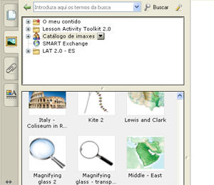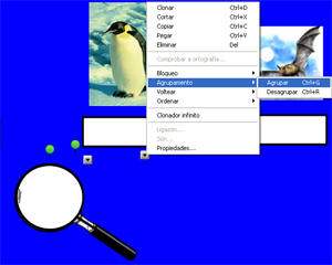 Agora imos á pestaña lateral GALERÍAS e no CATÁLOGO DE IMAXES despregamos o submenú IMAXES, buscamos unha lupa e a arrastramos cara á páxina. Logo seloeccionamos FORMAS e escollamos a ferramenta de facer óvalos. Facemos un óvalo do mesmo tamaño que a lente da lupa, colocámolo encima mesmo e agrupamos todo. Comprobamos que a lupa está en ORDENAR-CARA ATRÁS e BLOQUEAR-PERMITIR MOVER. | |