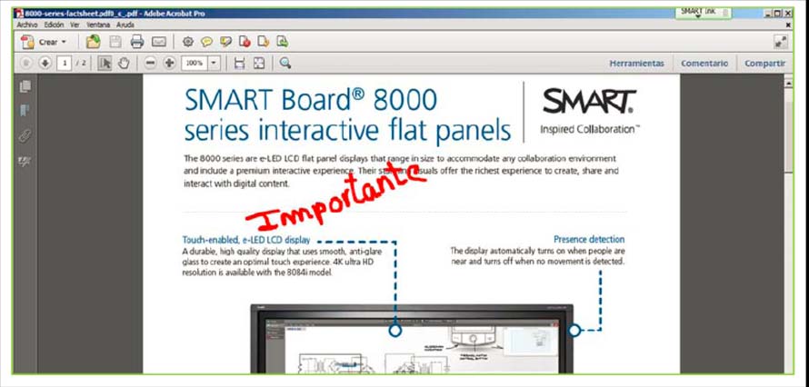 Cando traballamos sobre un PDF a forma de usar as ferramentas de SMART Ink é exactamente igual que se o facemos dende unha Web, é dicir, activamos o rotulador dende o menú SMART Ink ou dende a barra de ferramentas flotante ou da bandexa de rotuladores e escribimos o que desexamos, despois podemos capturar tamén: