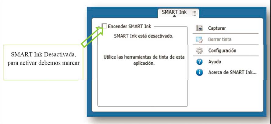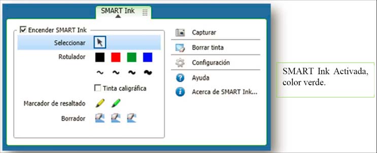 Para saber se a barra de SMART Ink está activada fixarémonos na súa cor, se está en verde está Activada e se está en gris está Desactivada, ademais cando está en verde e picamos sobre esta barra se desprega un cadro con diferentes opcións: Dende o menú do SMART Ink podemos realizar as seguintes tarefas: