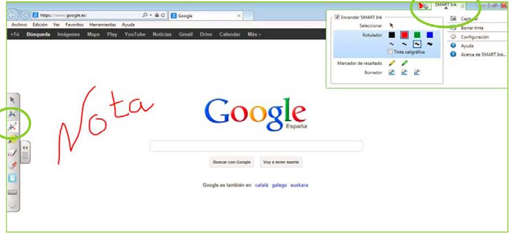 Cando estamos a traballar nunha web tamén podemos escribir ou marcar o que consideremos importante, para poder escribir poderemos activar a opción do rotulador dende o menú SMART Ink ou dende a barra de ferramentas flotante ou da barra de rotuladores:
