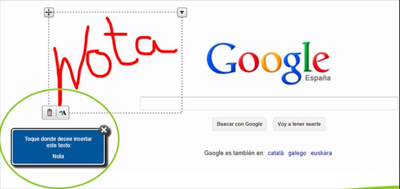 Tal e como indica a ventá, agora debemos tocar co dedo/rotulador (coma se o noso dedo/rotulador fose o rato do ordenador) no lugar onde queremos poñer o que escribimos: